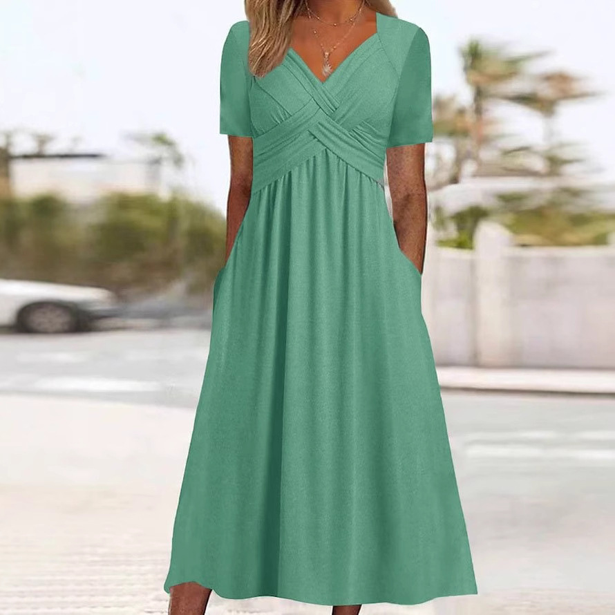 2025春夏欧米越境アマゾン独立駅ファッションカジュアル婦人服純色vネックポケット七分袖tシャツ