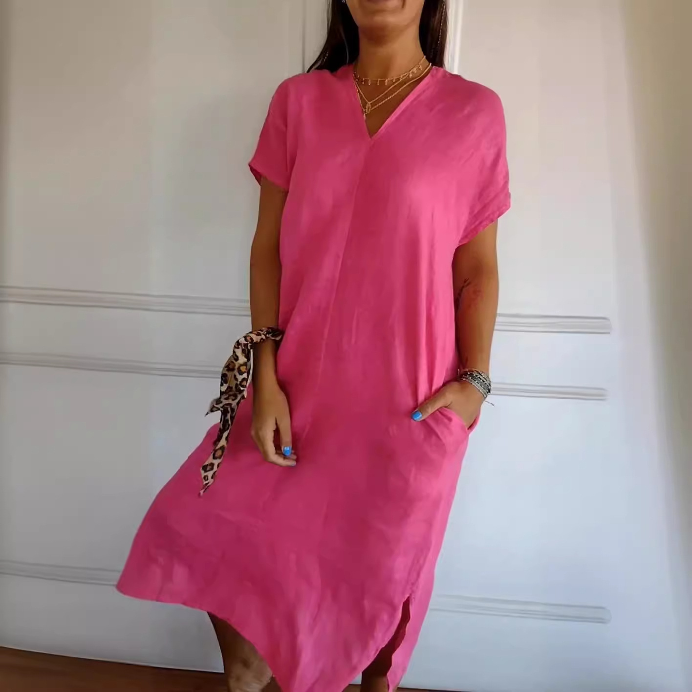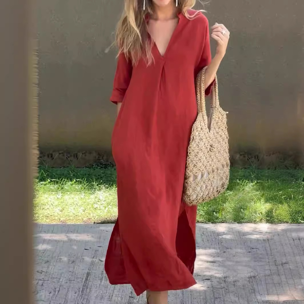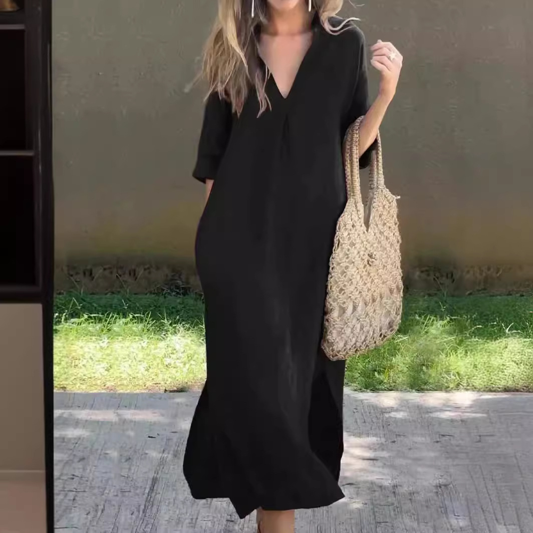2024アマゾン新型欧米クロスボーダー女性式夏ゆったりカジュアル純色半袖綿麻ワンピースロングスカート