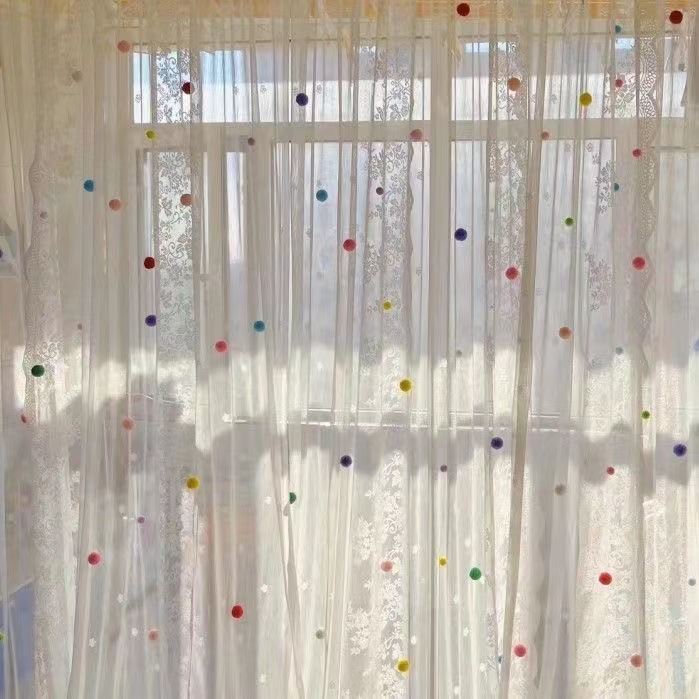 韓風レースカーテン小清新クリーム色寝室児童部屋カラー丸点半遮光カーテン仕切りカーテン