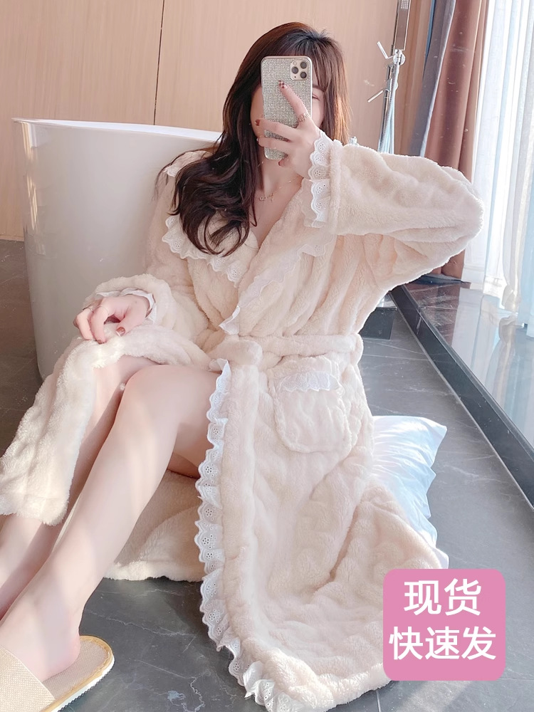 2024年の新型の寝衣の女性秋冬の甘くてセクシーなサンゴの絨毯の厚い長いタイプのパジャマの冬のバスローブの部屋の服