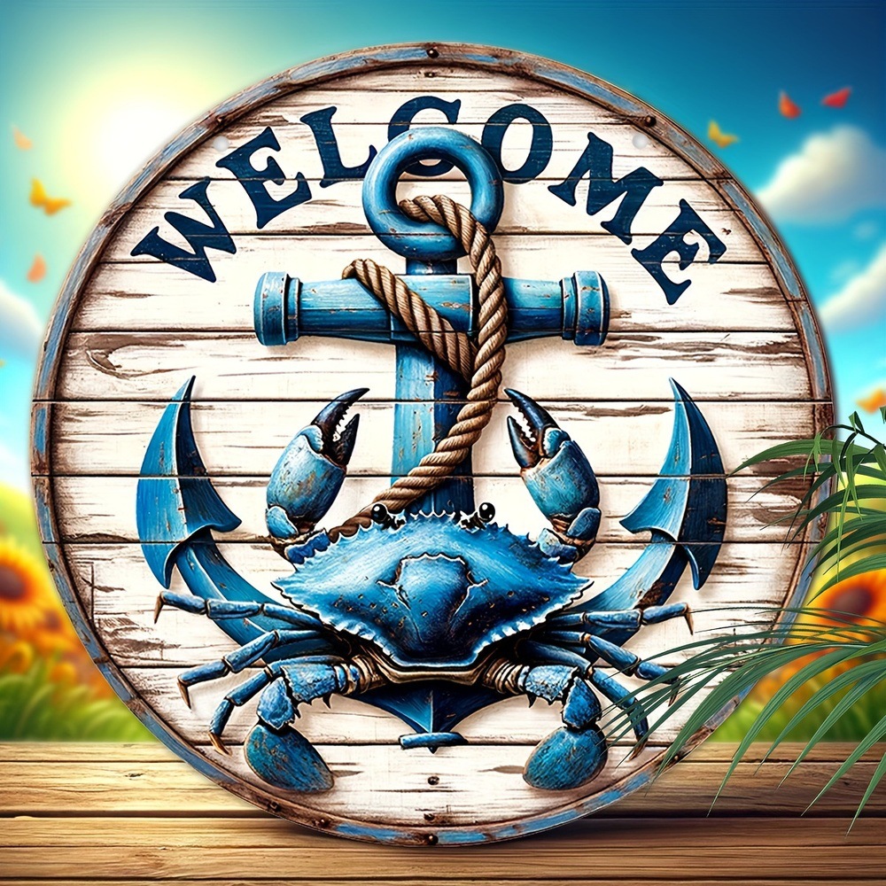 現物のアメリカの木製の丸いカニの船の錨の標識の看板の木製の歓迎の表札の海辺のレストランの壁面の装飾