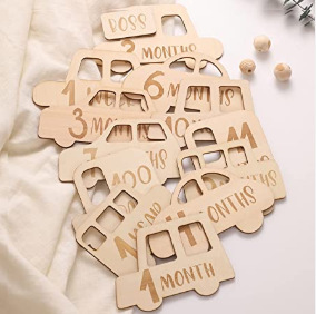 現物の赤ちゃんの木製の車の月の札の木片の赤ちゃんの新生児の一里塚の満月の記念の写真の道具