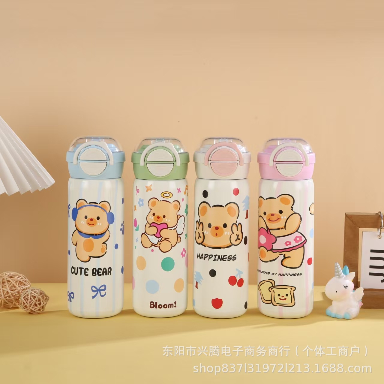创意304不锈钢保温杯幼儿园卡通黄油小熊吸管杯便携式手提双饮杯