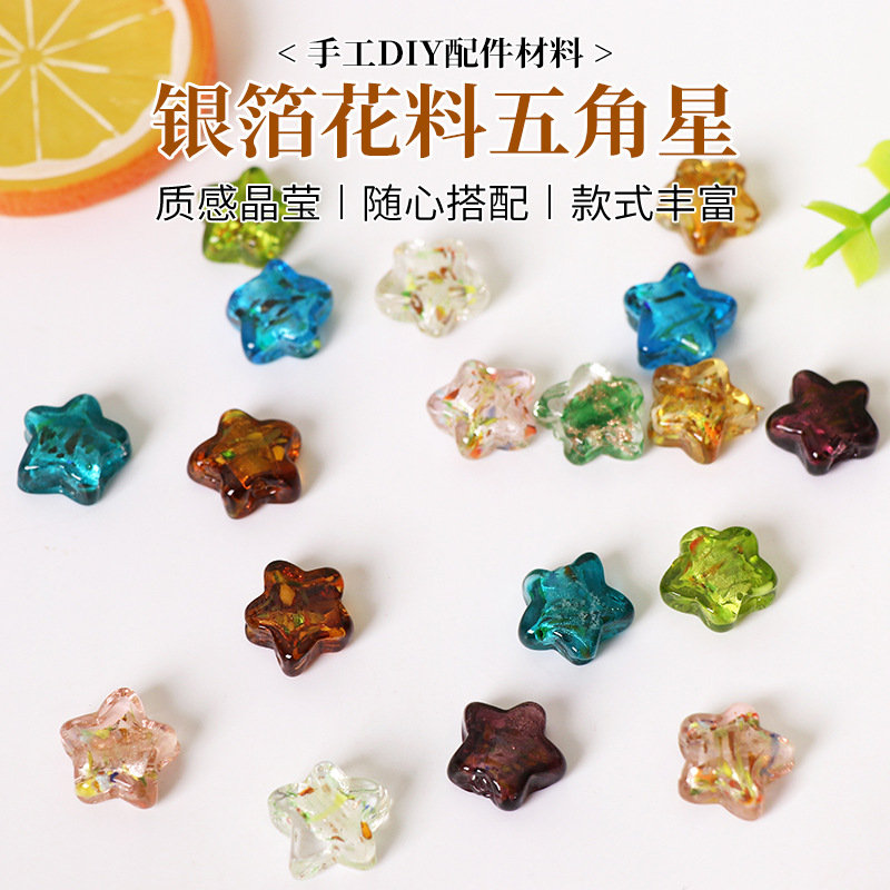 金沙五芒星ガラスビーズストレートホール diy 透明ガラスビーズ銀箔スター手作りヘアピンタッセルルースビーズ