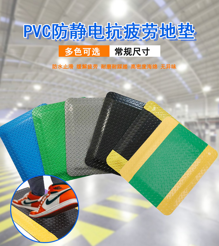 工場の作業場に立っている高反発滑り止めマット静電気防止疲労防止マット黒黄辺緩和疲労防止マット