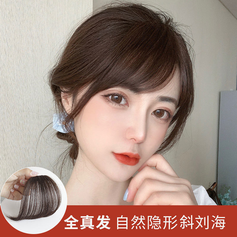 全本物の髪の偏った斜め前髪のかつらの三七分のファッションの前髪の額は薄くて薄いです。