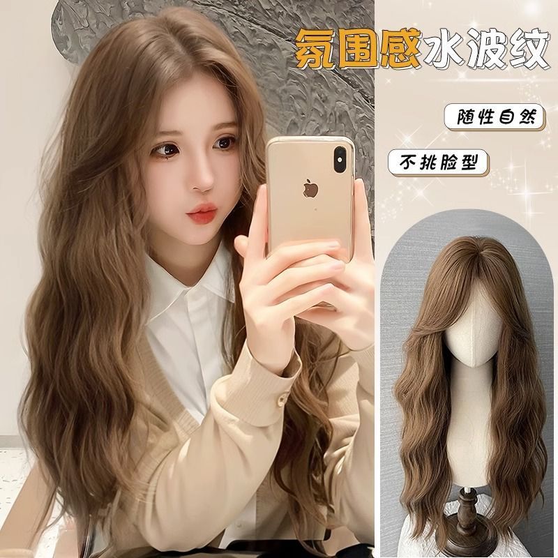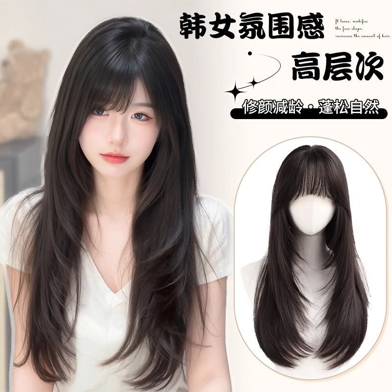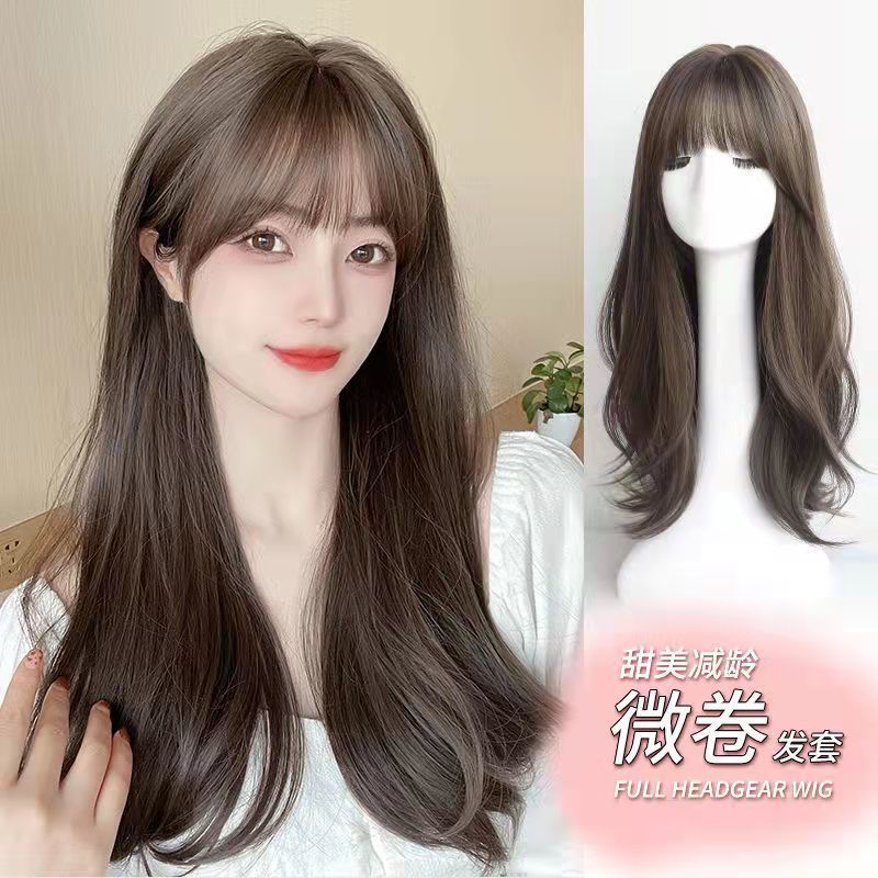 女性用ウィッグ、フルヘッドセット、紅茶色のロングストレートヘア、ハイレベルな前髪、シームレスな年齢軽減、ふわふわフルウィッグセット