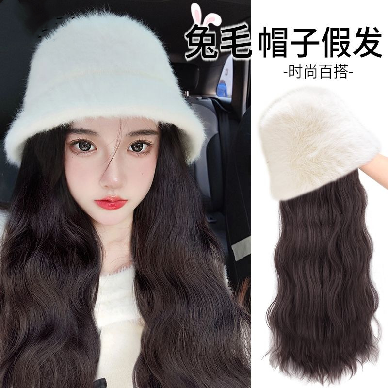 若蘭家帽子かつら一体ファッションシミュレーション秋冬兎毛漁師帽大波長カール全頭カバー