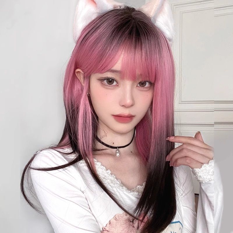 かつらの女性の長いストレートのピンクのグラデーションcosギャルのファッションのステルスがないことをシミュレーションします。