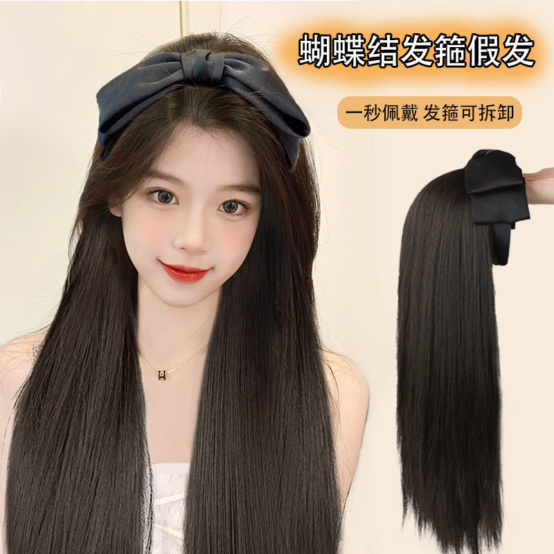 若蘭ウィッグ 女性用ロングヘア 蝶結びヘアバンド ショートヘア一体型 シミュレーションファッション 自然なシームレスロングストレートヘアピース