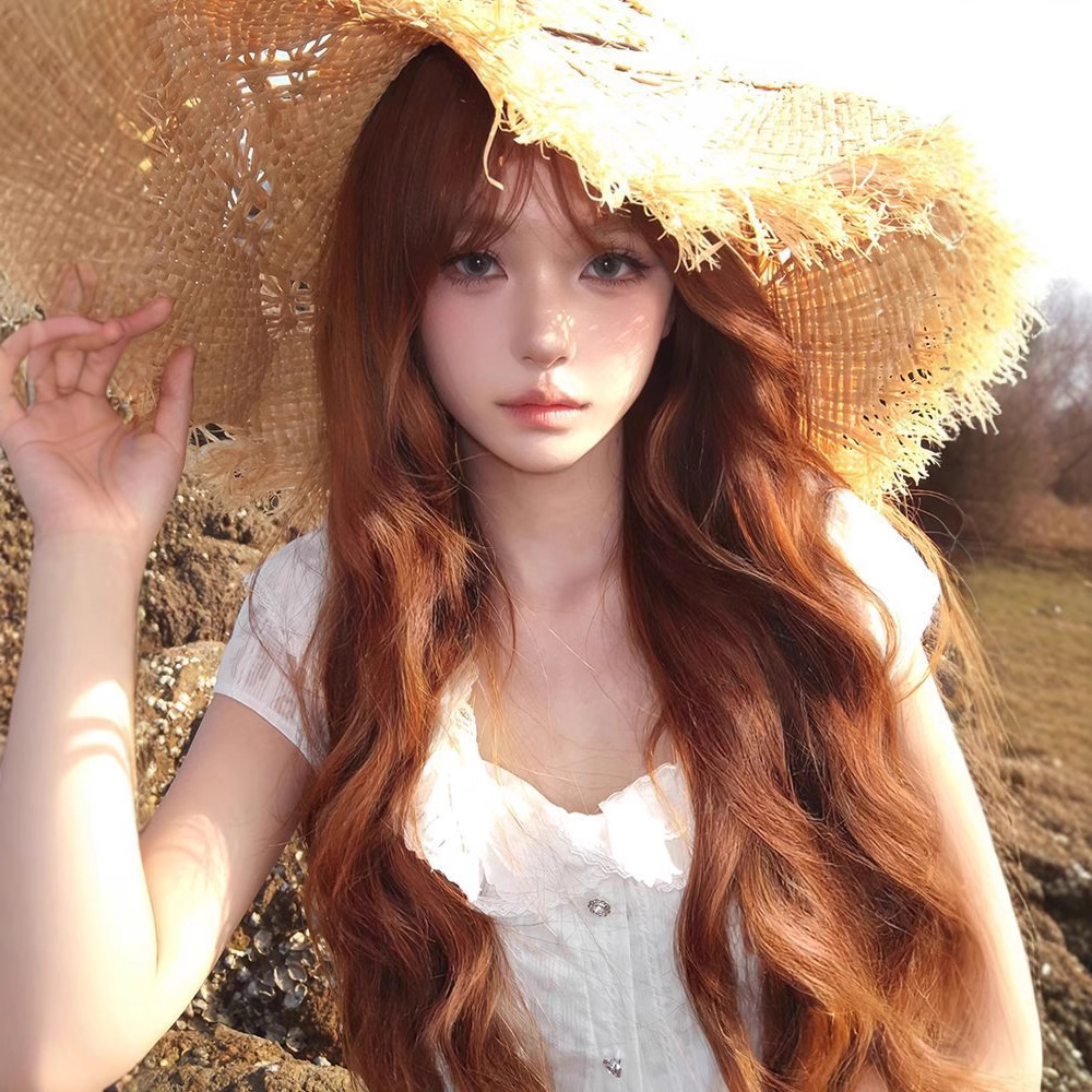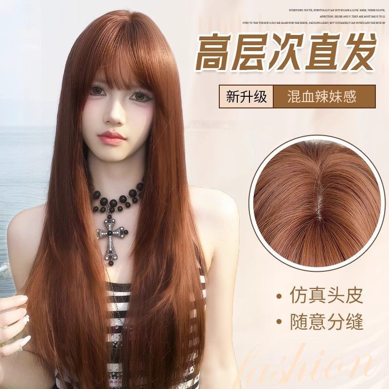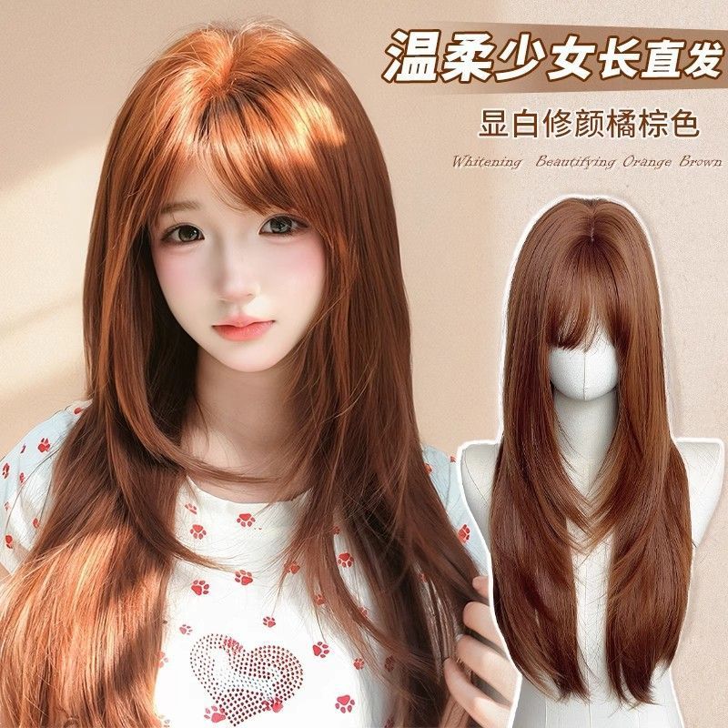 女性用ウィッグ、フルヘッドギア、ハイレベルオレンジブラウンのロングストレートヘア、女性用、ファッショナブルでナチュラル、フルヘッドギア、顔の整形と年齢軽減