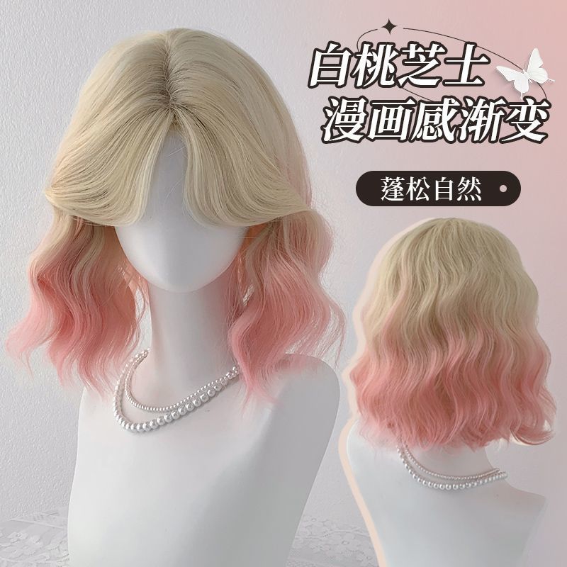 【白桃チーズ】女性用ウィッグ コミック風ミドル分け前髪 ピンクゴールド グラデーション ショートカーリーヘア ナチュラル フルヘッドカバー