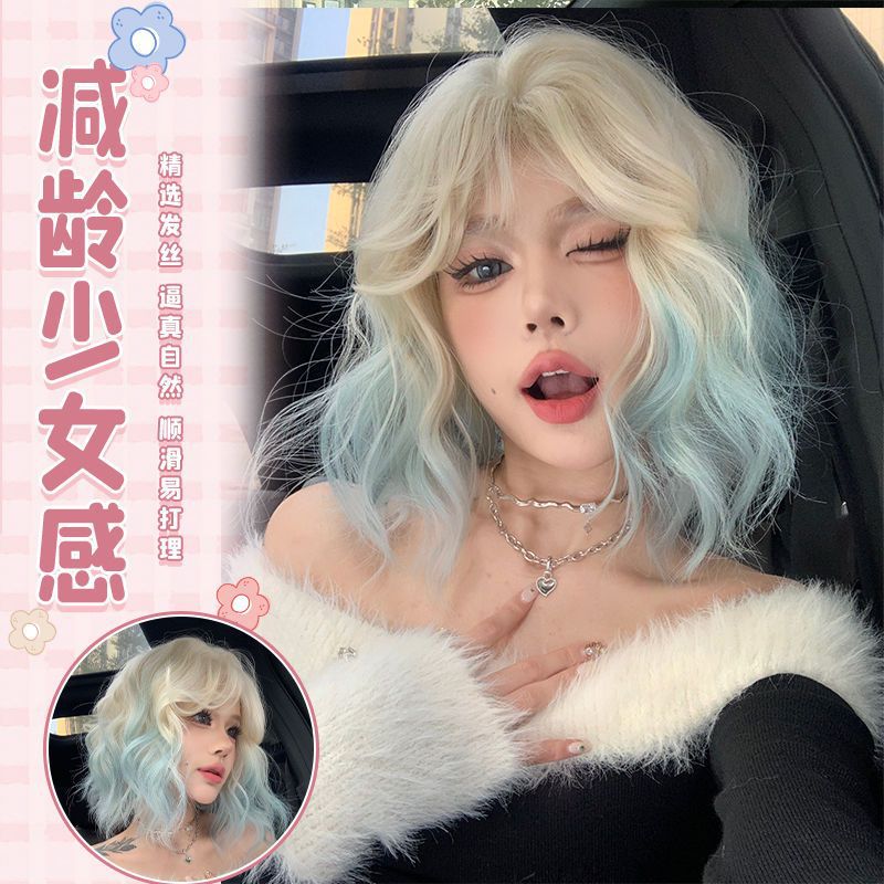 かつらの女性の初春のファッションの卵の巻きのショートヘアのプラチナのグラデーションのミントの色の日常のシミュレーションの髪の糸の甘いクールなかつらのセット