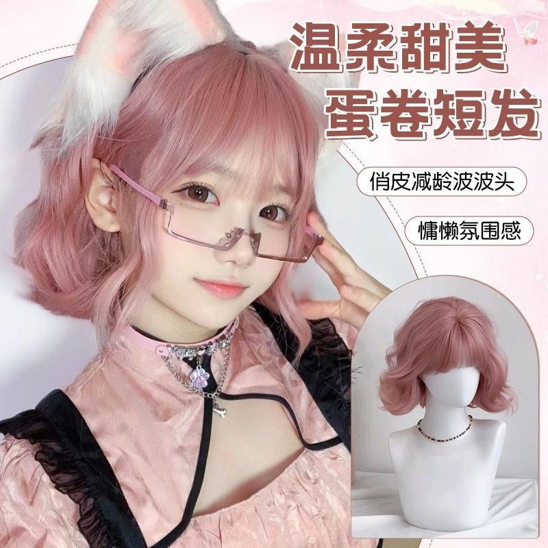 ピンクの短いカールのかつらの女性の全頭カバー式のlolitaの日常のウールは日本のかわいい柔らかい妹jkのかつらを巻きます。