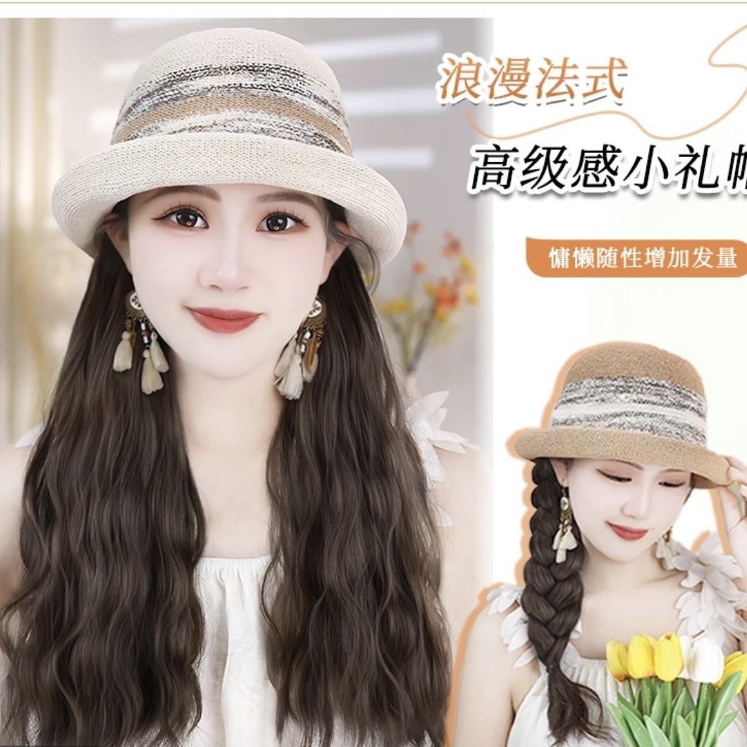 【優しい気質】かつら女性フレンチ巻き帽子かつら一体ロングカール高級ファッションかつら帽子