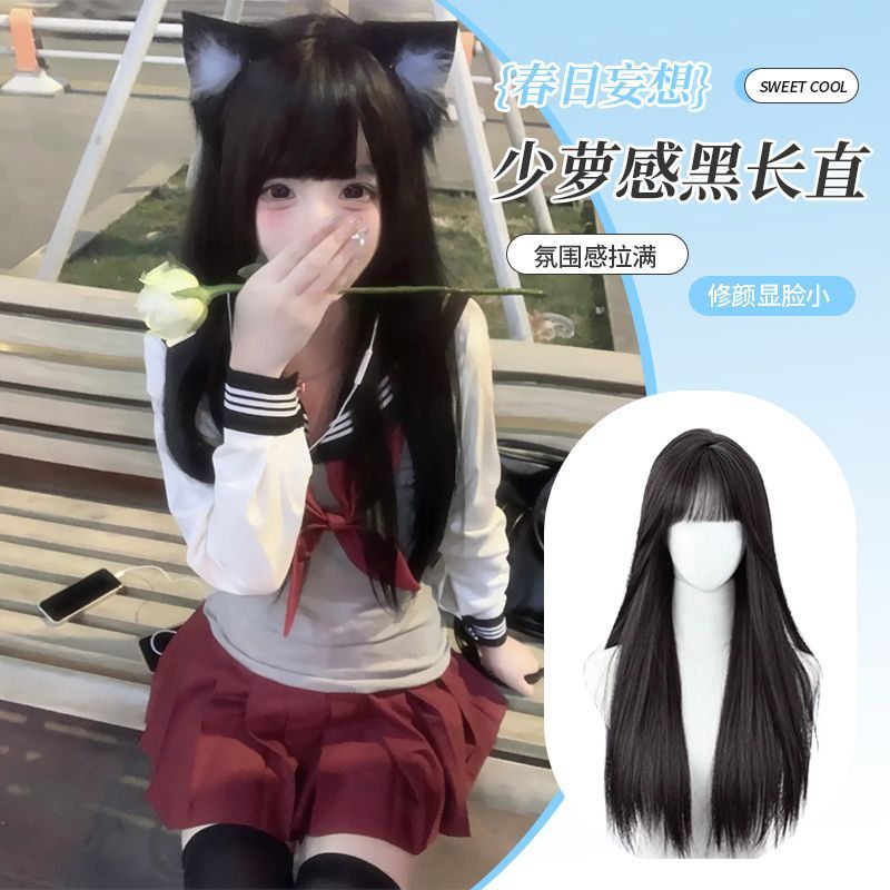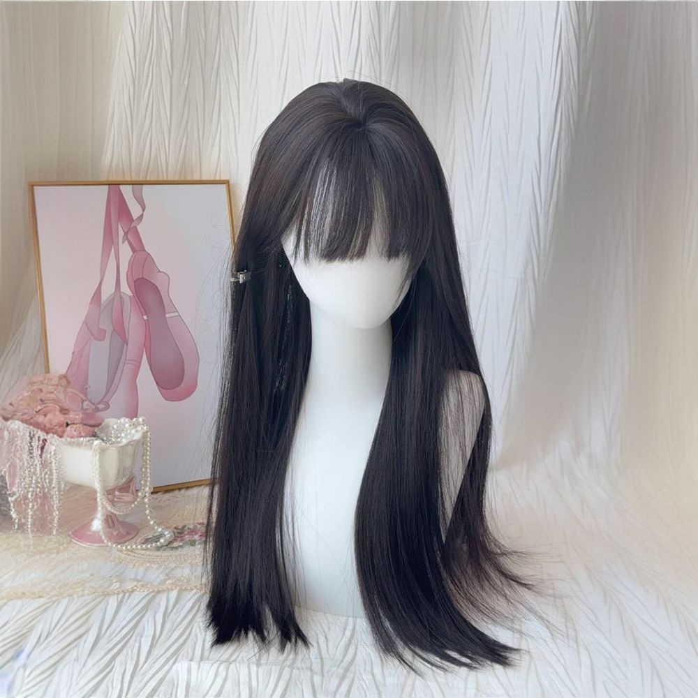 前髪が揃った女性用ウィッグ、ロングストレートヘア、ガールズグループスタイル、デイリーナチュラルスイートエア前髪、かわいい年齢軽減フルヘッドギア