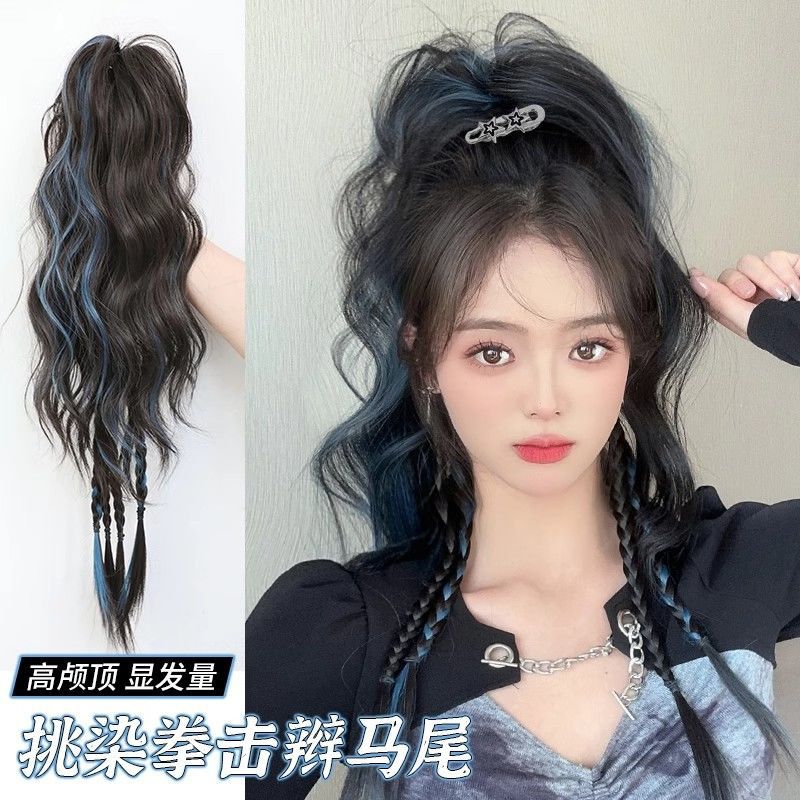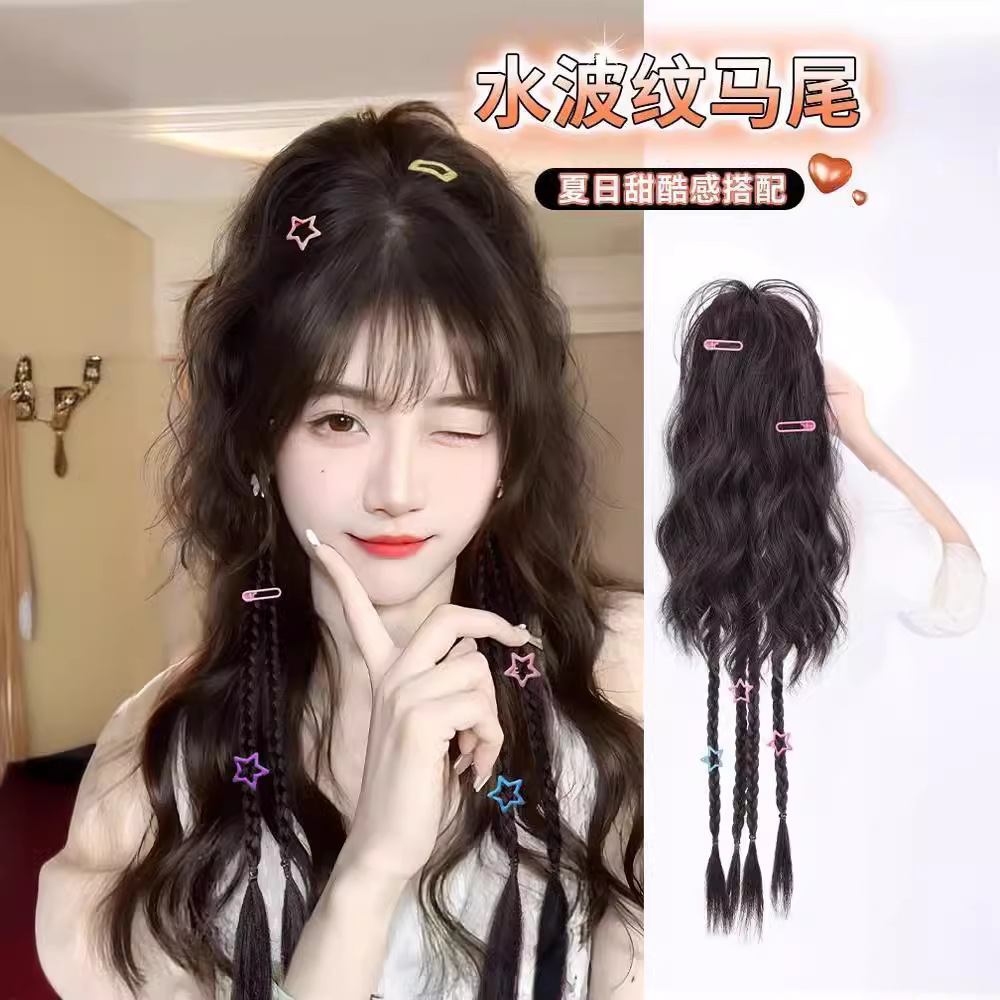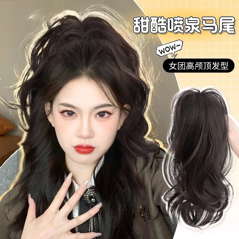 かつらの女性は滝を挟んでお下げの馬尾を巻いて一体になって高い頭の馬尾のシミュレーションの噴水の馬尾のお下げを結びます。