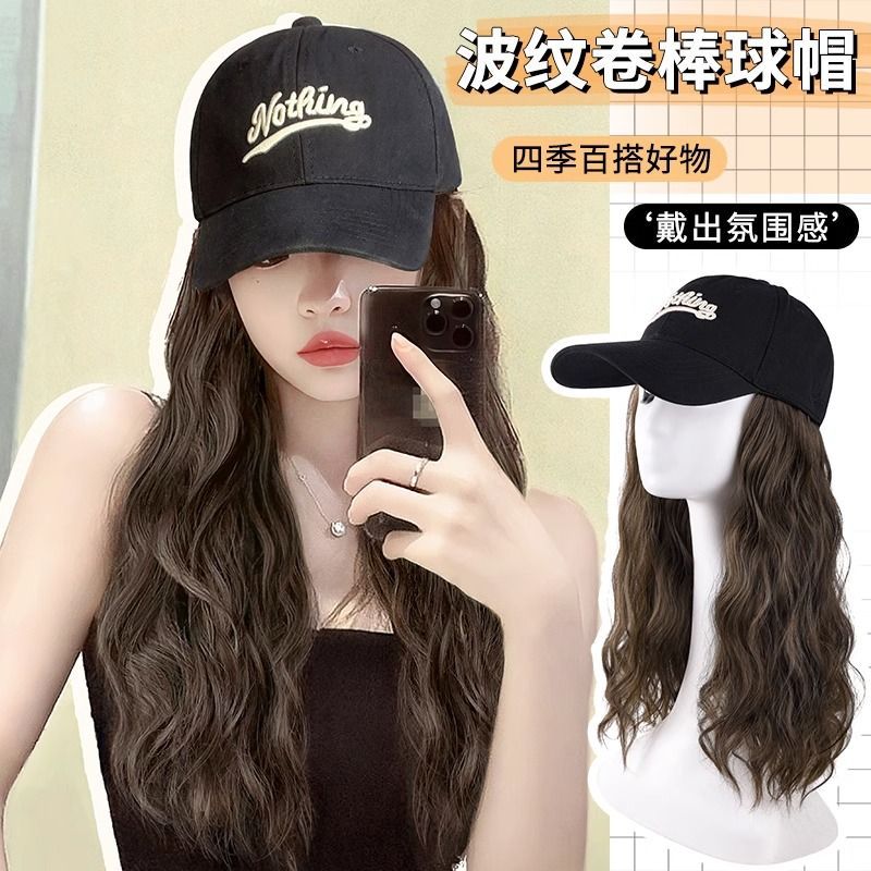 No野球の帽子のかつらの女性のウールの巻きの新型の韓国版の大きい頭は顔の小さい水の波紋の一体のかつらの帽子を現します。