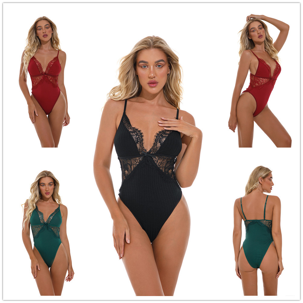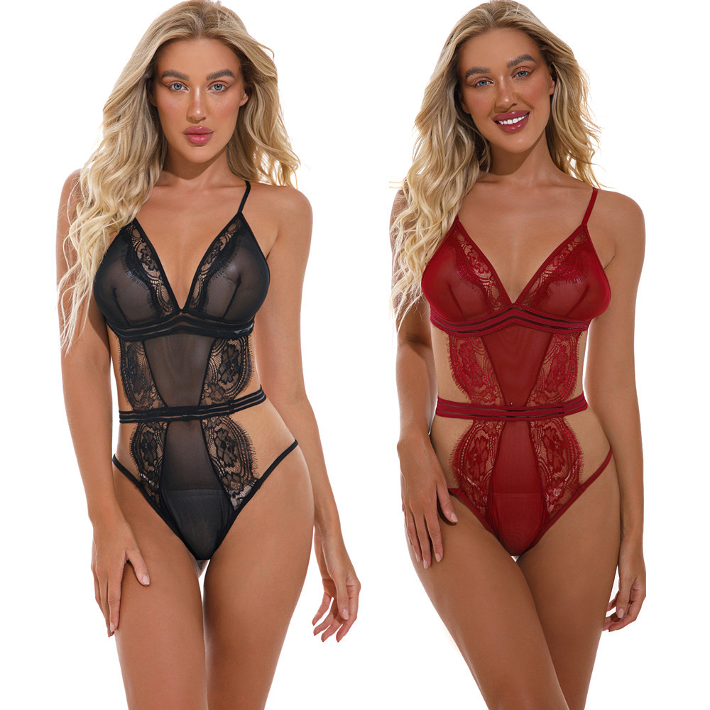 2023アマゾンの女性のvネックの交差するひもの情緒の下着のレースの透視の透かし彫りのセクシーな首輪の連体の服