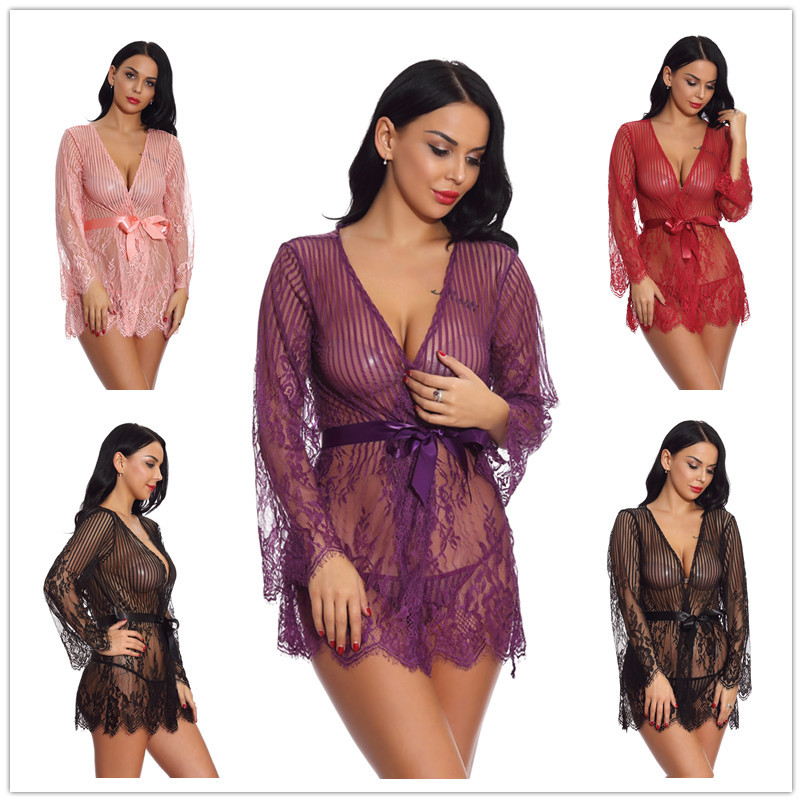 欧米のアマゾンの婦人服のセクシーなレースのまつげの透視前の開襟の長袖の寝スカートの現物