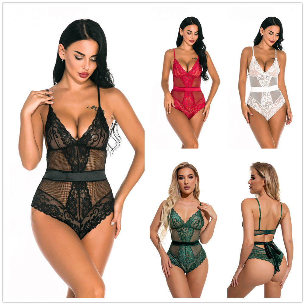 独立駅のクロスボーダー婦人服の新商品の深いvレースの網の目はつなぎ合わせて微に背の激情の情緒の下着の連体の服を明らかにします。