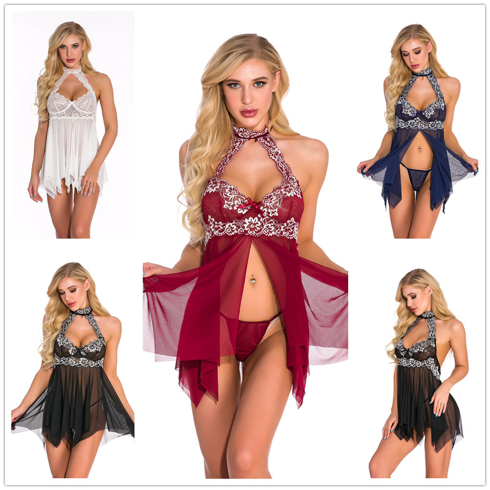外国貿易の新型のセクシーな首を掛けて背中を現してレースの情緒のパジャマを透視します。