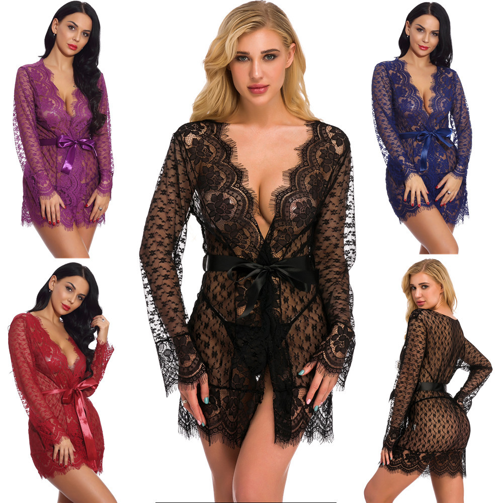 クロスボーダー速売通2022新商品女性レース趣味下着アマゾンレース網糸前開襟セクシーパジャマ