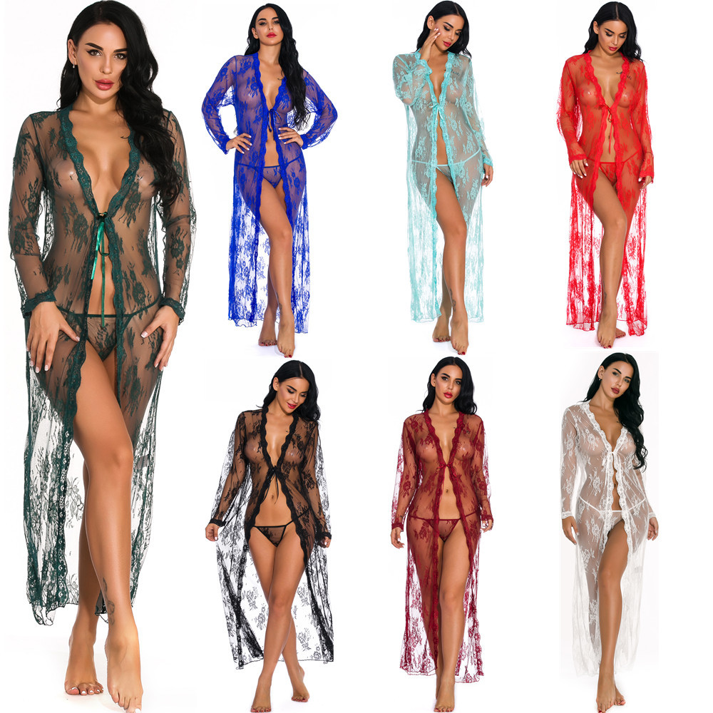 半袖透視趣味下着リボンウエスト着物寝衣レースセクシーカーディガンロングスカートRobeビーチブラウス