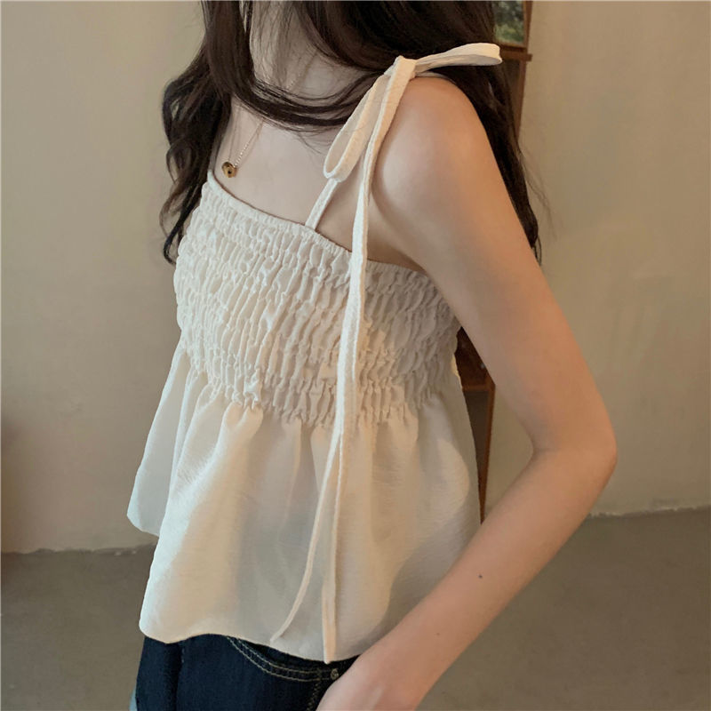夏 2025 新しい韓国スタイルの甘い無地ショートレースアッププリーツフラットカラースリム小さなキャミソールトップ女性のための