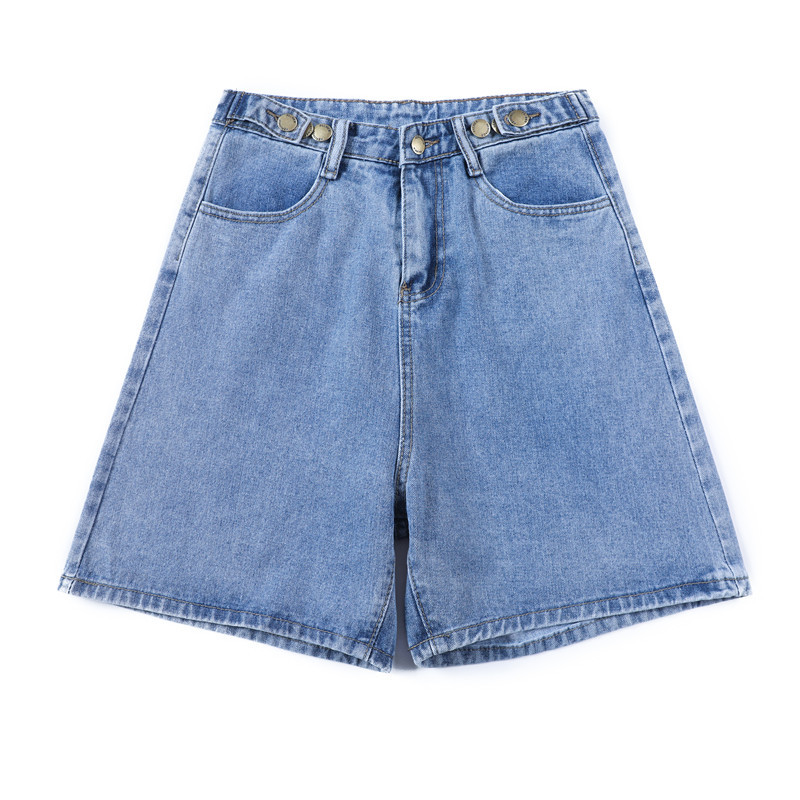 ネットの赤いデニムの半ズボンの女性の腰が高くて痩せています。