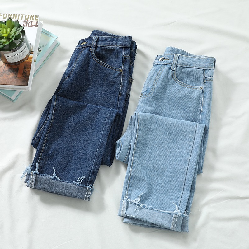 2023春夏の新型韓国版の毛の縁の9分のジーパンの女性のハイウエストはゆったりしていてやせているストレートなズボンのins潮が現れます。