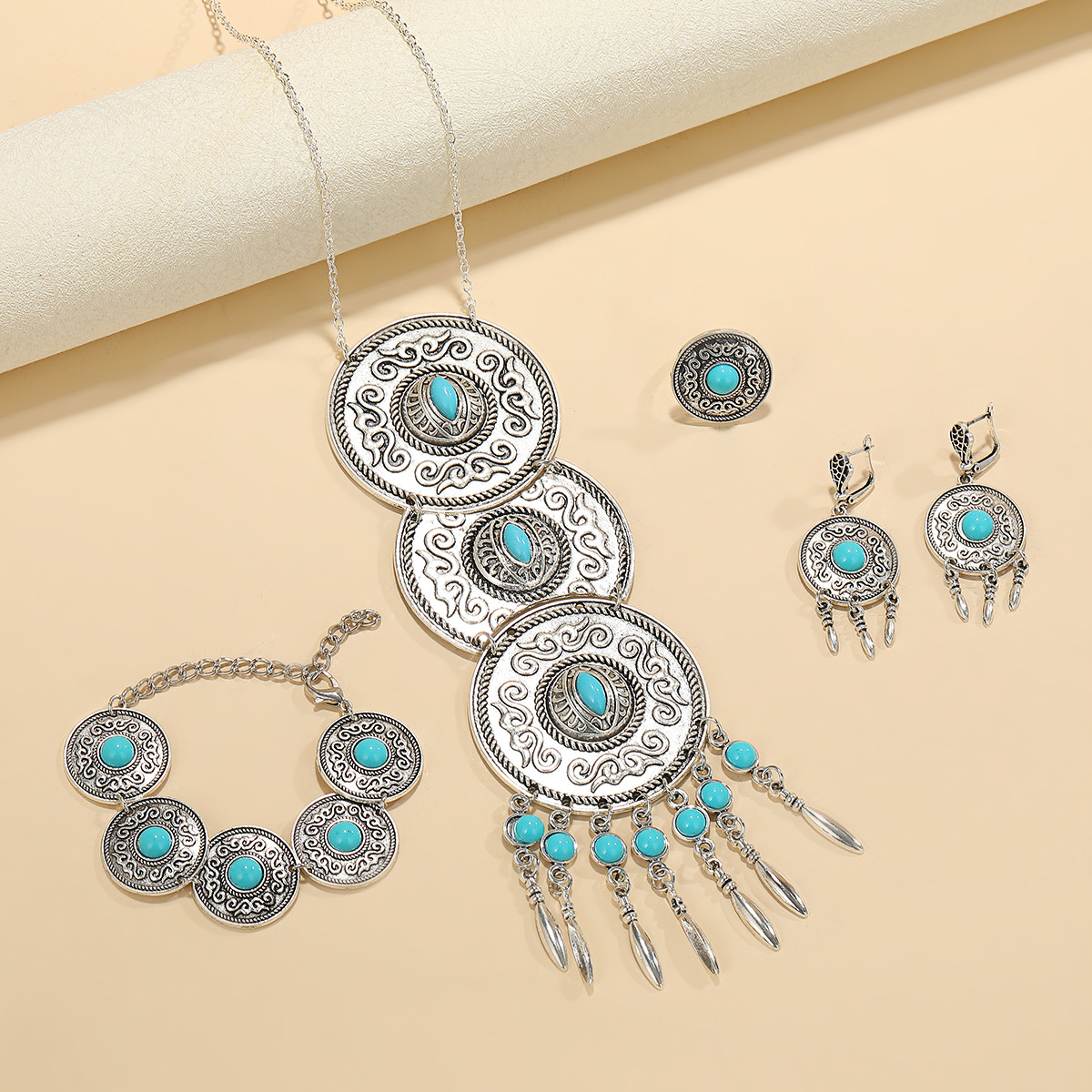 エスニックスタイルクリエイティブ合金ネックレスリングブレスレットイヤリング 4 点セットレトロパーソナライズジュエリーカザフジュエリー