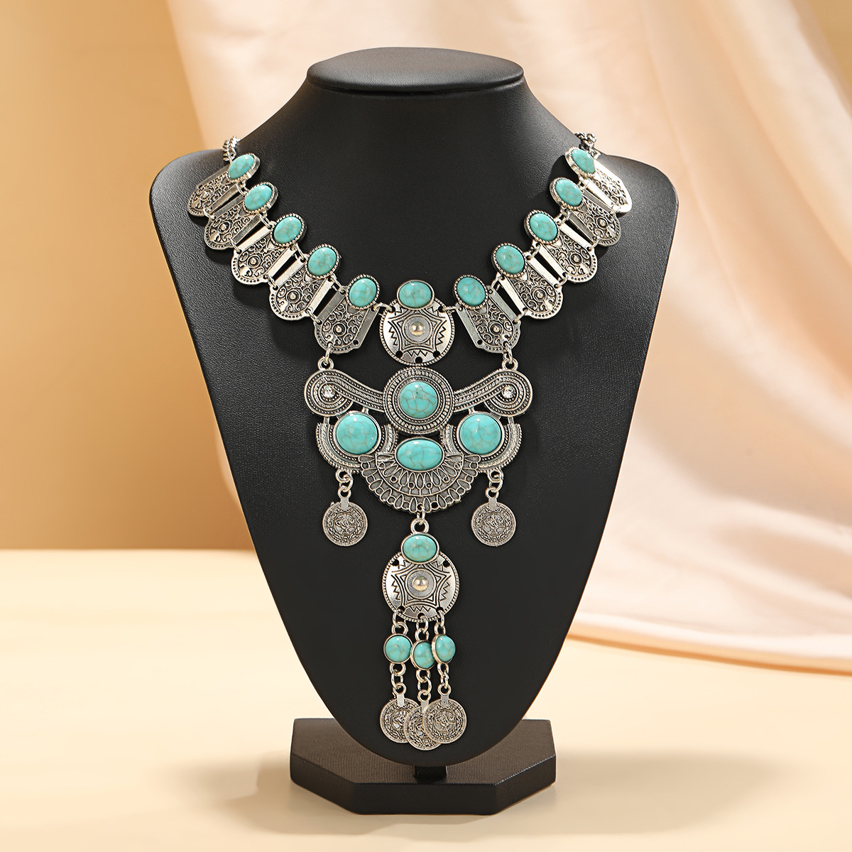 メーカーの新しいボヘミアンスタイルのファッショナブルなネックレスとイヤリングセット、ターコイズ彫刻模様のタッセルジュエリーが象嵌されています