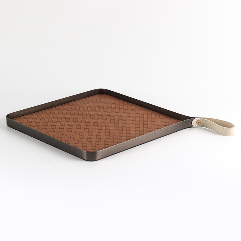 デザイナーの芸術は革の取っ手のトレーを編みます。