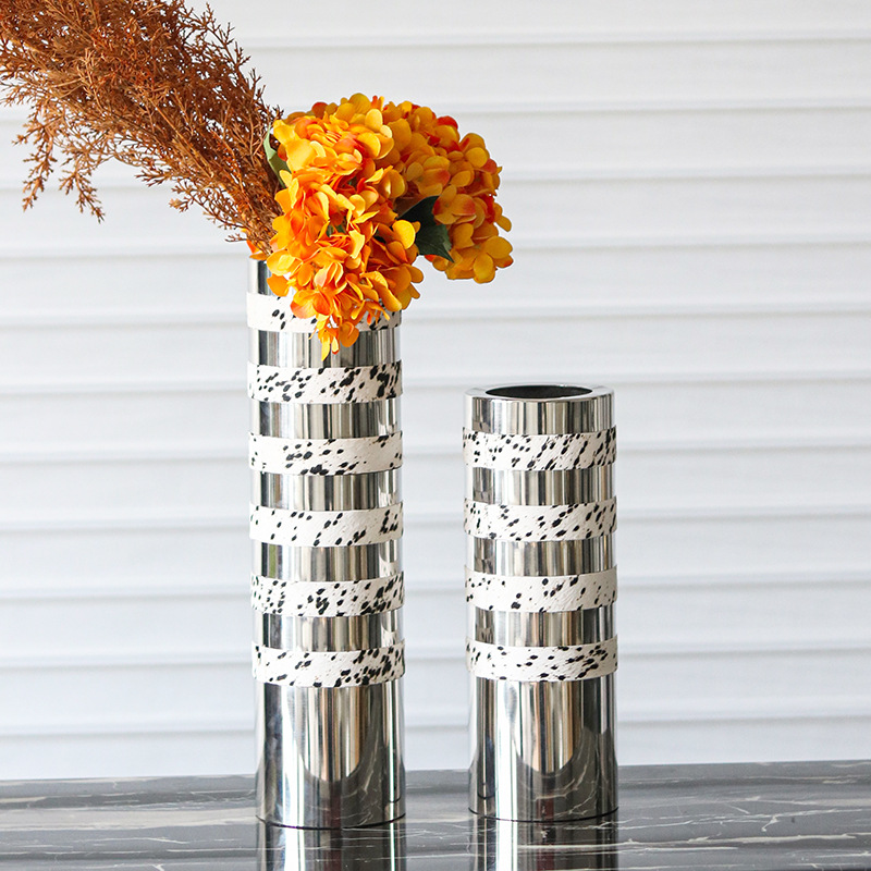 シンプルなヨーロッパ式の花瓶の軽い豪華な金属の皮質の円環のまっすぐな筒の花器の見本の部屋のビルの売り場の柔らかい装飾品の置物