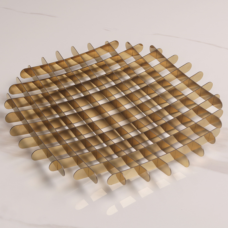 北欧の軽い豪華な金属の網の透かし彫りの丸いトレーのワッフルの形の果物の皿の現代の簡単な客間の置物