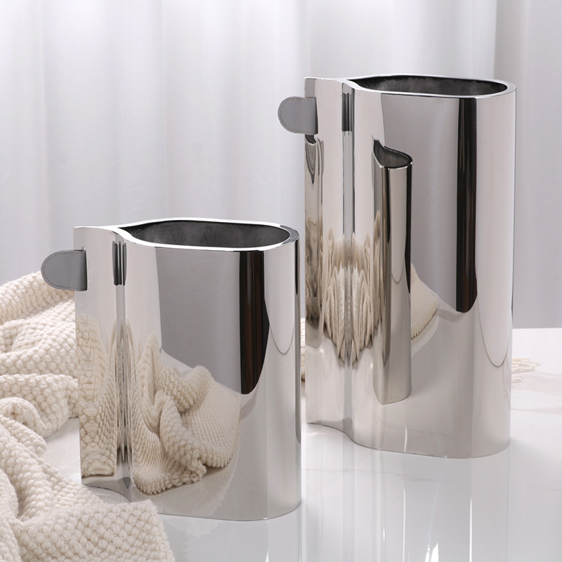 現代の軽い豪華な金属の花瓶の置物の瑠璃の見本の部屋の軟装の家庭の装飾品の皮質の片耳の不規則な花器