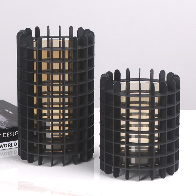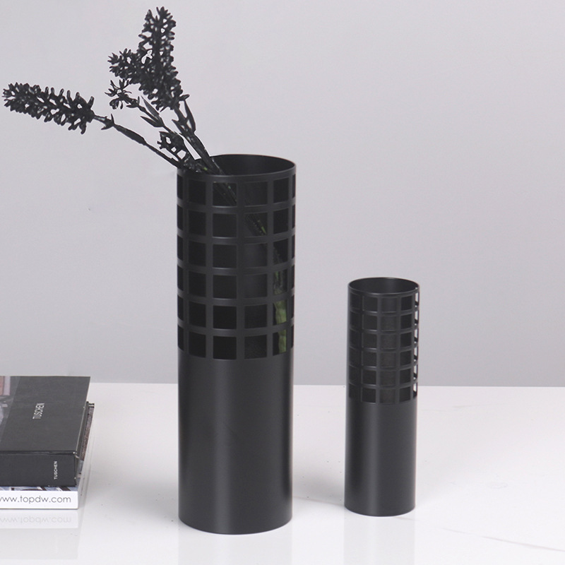 非常にシンプルな現代的な黒い金属の透かし彫りの芸術の花器の見本の間の売り場の客間の玄関の花瓶の装飾品の置物