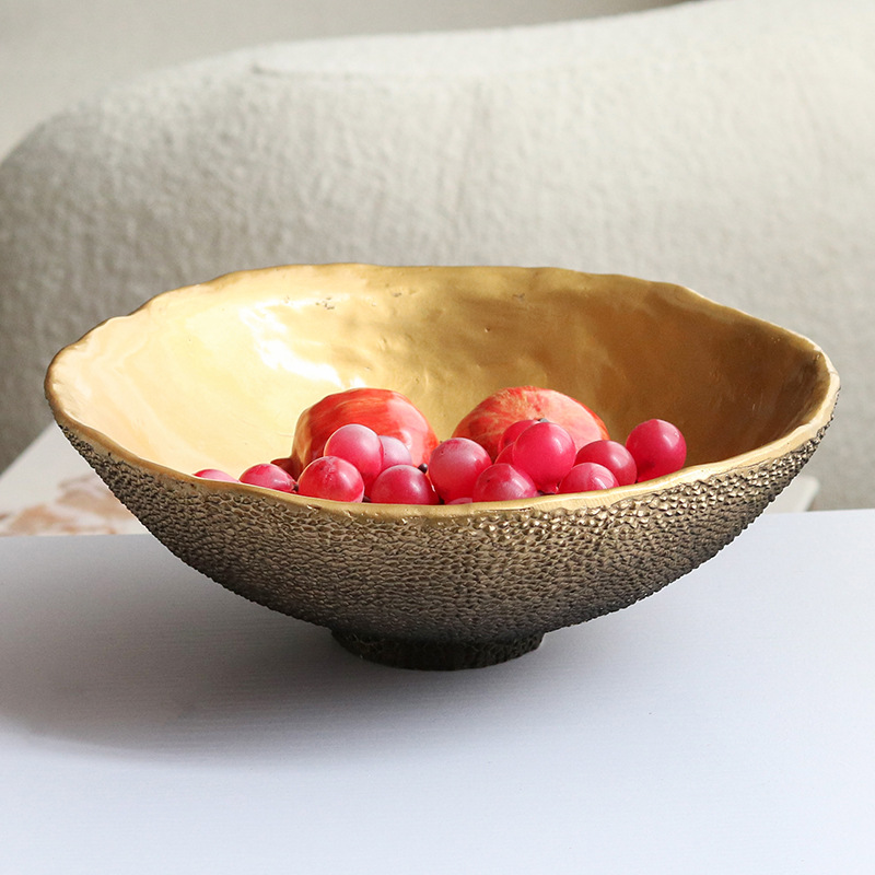 現代の創意は軽くて豪華で異形の金属の凹凸のレイシの紋様の果物のたらいの置物の家庭の客間は碗の装飾品を収納します。