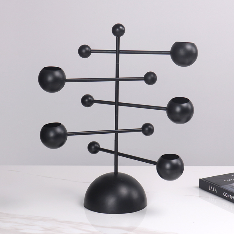 極めてシンプルな現代銀色の黒い幾何学金属回転燭台のサンプルルームの室内のテーブルのデスクトップのデザイナーの置物