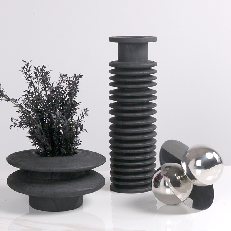 黒い日本式の寂しい風の花瓶は木目の積層の置物のサンプルの部屋の客間の博古の花器の棚の装飾品をまねます。
