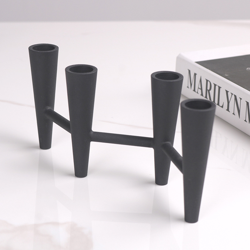 非常にシンプルな現代銀色の黒い金属の幾何学的なアイデアの燭台のサンプルプレートの間の別荘の客間の室内の柔らかい装飾品