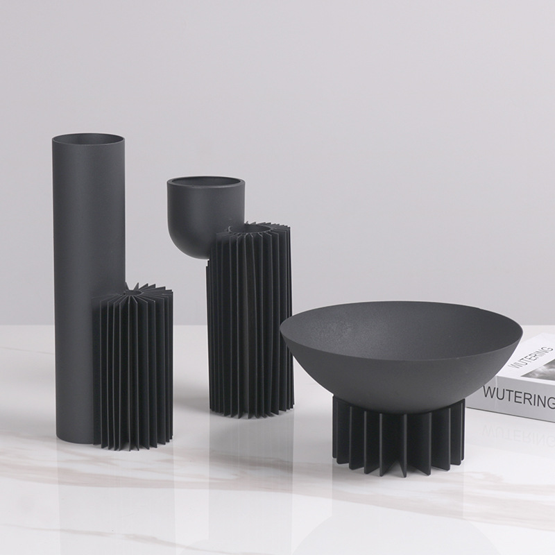 シンプルで現代的なアイデアの黒い金属のネジのルーバーの生け花の器の果物の皿の玄関の客間の組み合わせの装飾の置物