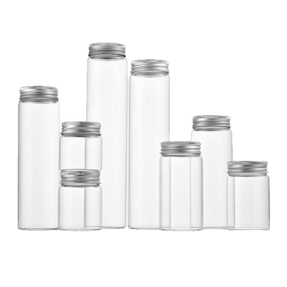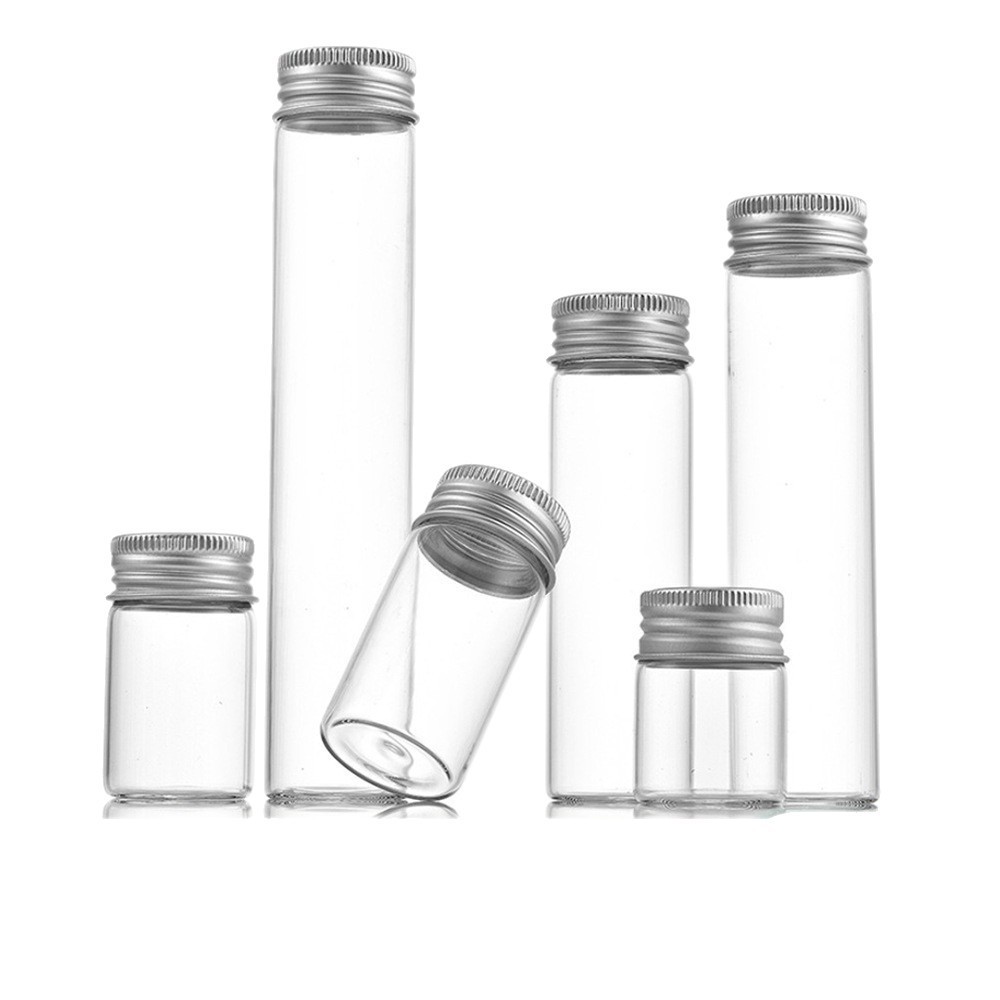 直径47mm 多容量透明ガラス瓶 シルバーアルミキャップ チューブボトル ドライフラワーカプセル 薬用コーヒー豆包装