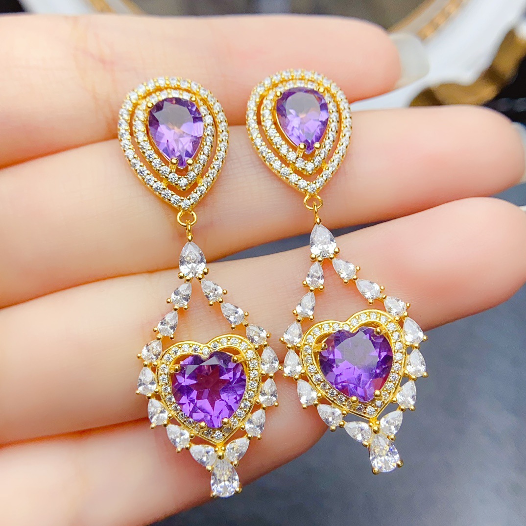 新天然紫水晶ピアスS925銀モザイク主石6*8mm百合ネット赤爆金女飾り卸売り