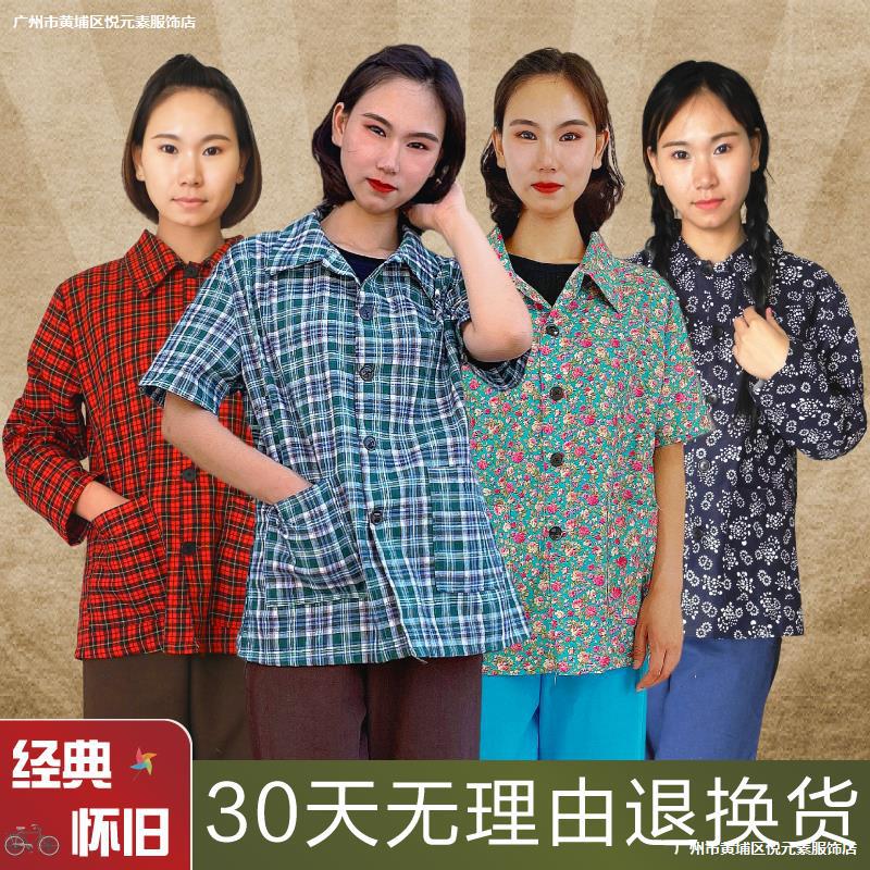 80年代のレトロな服装の上着の半袖のプリントの格子の婦人服の襟のシャツの90年代の花の服の女性の村の姑
