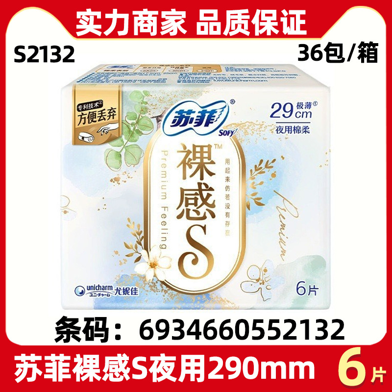 ソフィー生理用ナプキン卸売 ヌードSソフトコットン 290mm 夜用 6枚入り 多量夜用 通気性のあるシルクのような薄手の生理用ナプキン