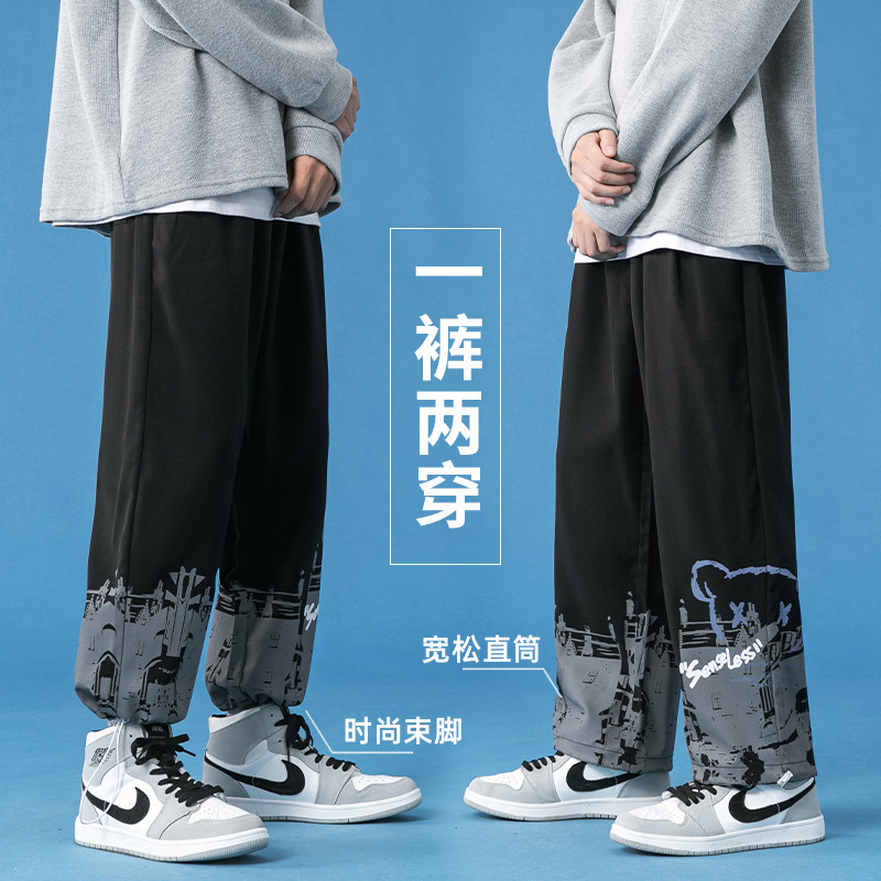 カジュアルパンツ男性春秋香港風ゆるいストレートスポーツパンツins潮牌アルファベット染め足九分衛ズボン