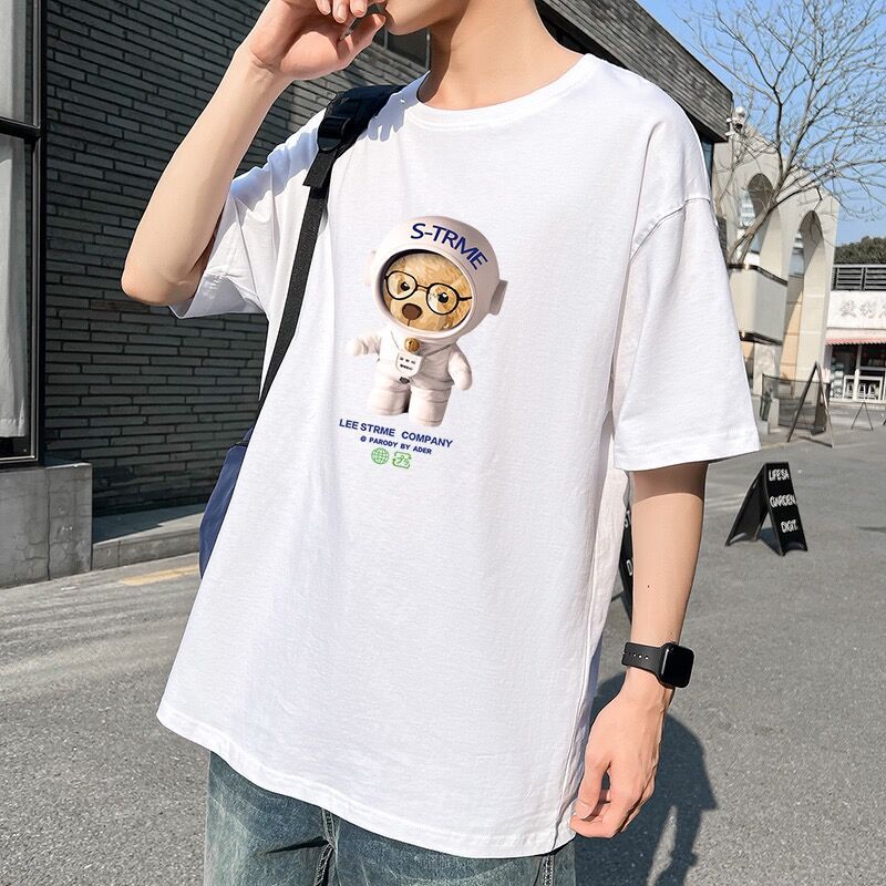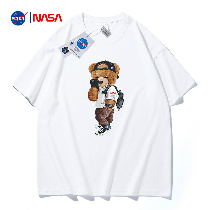 夏の肩落ちゆるいtシャツNASA宇宙飛行ベアープリント半袖tカップル百合韓版潮半袖綿ins
