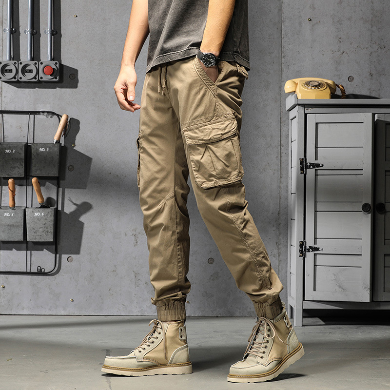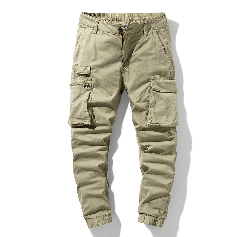 2025春の工装ズボンの男性のゆったりとした多ポケットの足のズボンのカーキ色のストレートのファッションのカジュアルなズボン